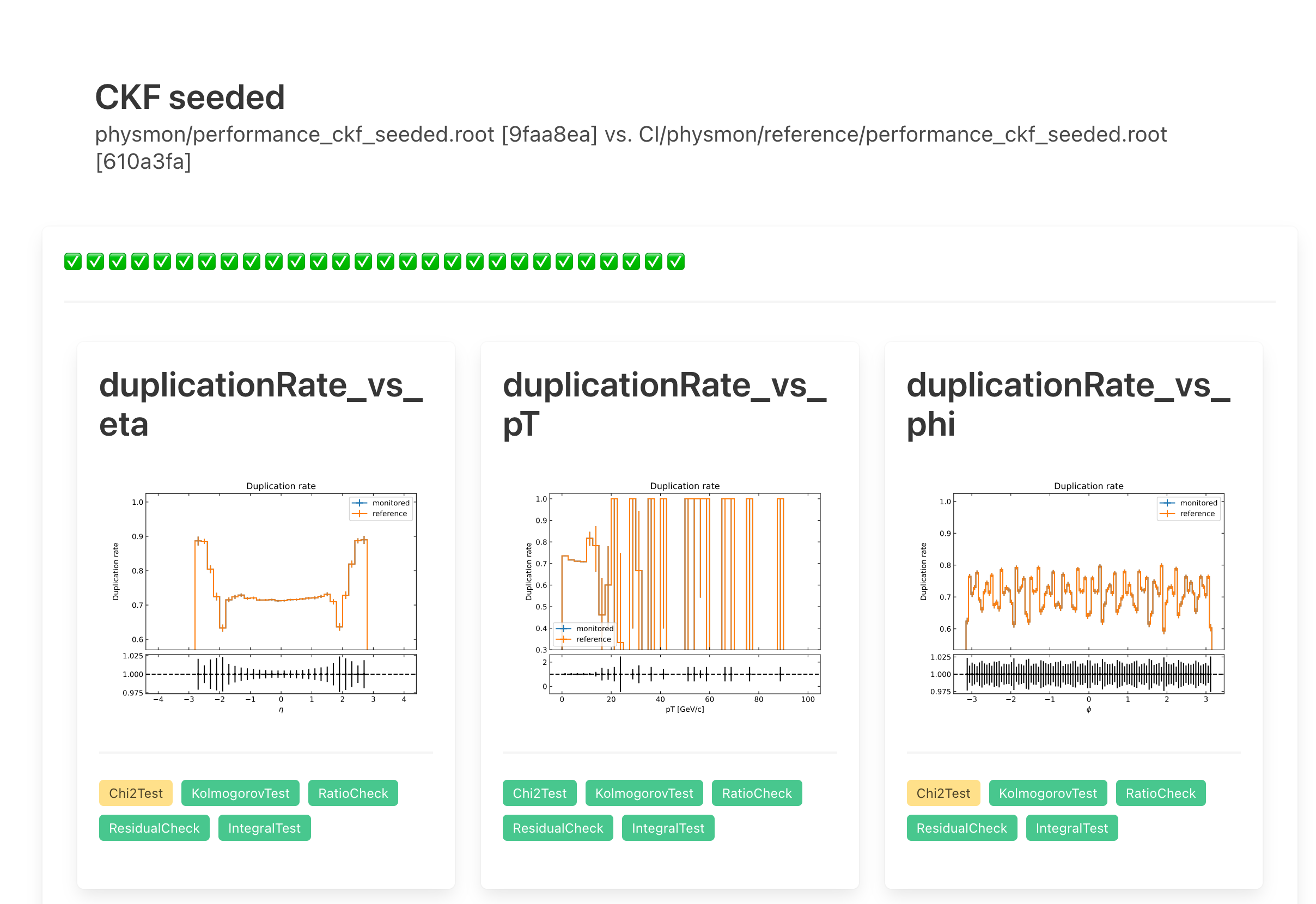 The ACTS CI runs a suite of physics performance monitoring jobs dubbed physmon. The purpose is to monitor and detect changes in the physics performance, both intentional and accidental.